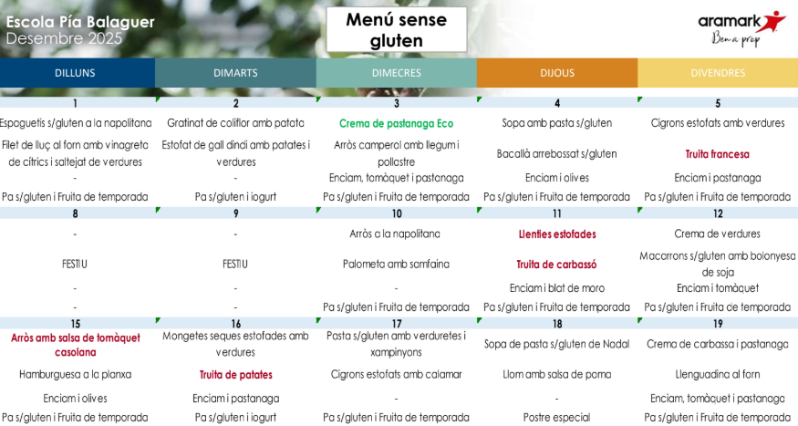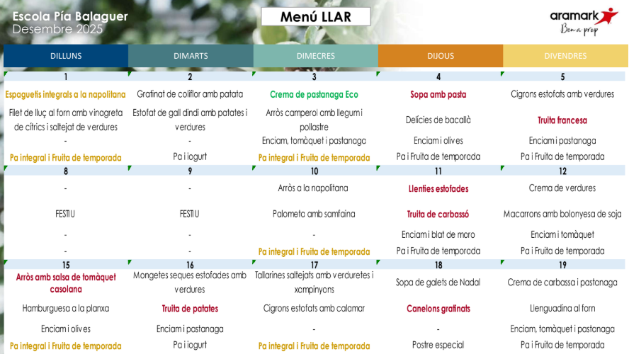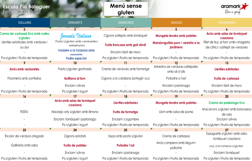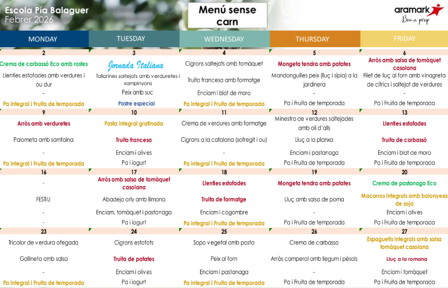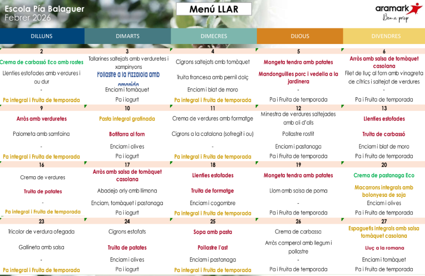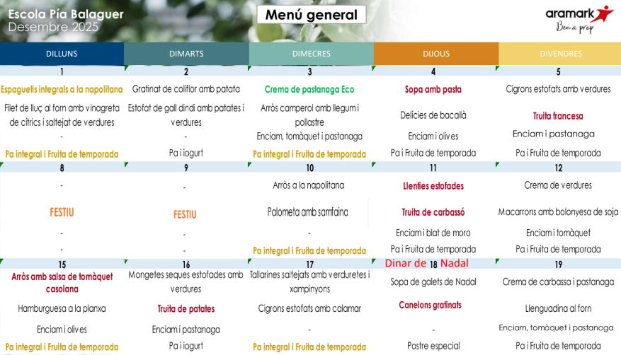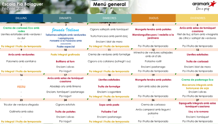 A la nostra escola tenim cuina pròpia on es prepara tot el menjar «in situ». El menú està elaborat per l’empresa ARAMARK que compta amb productes frescos, de proximitat, ecològics i de temporada.
